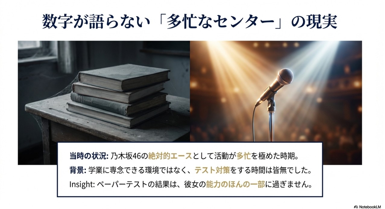- 乃木坂46時代の学力テストでは31人中25位という結果でしたが、そこには多忙な活動背景がありました。